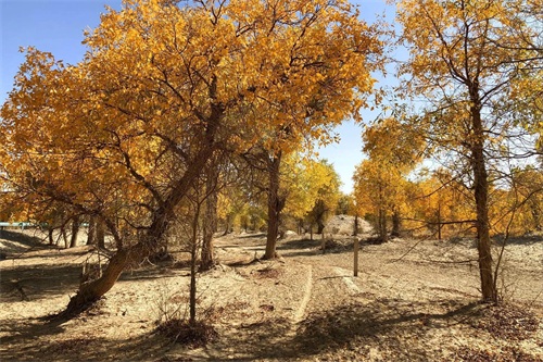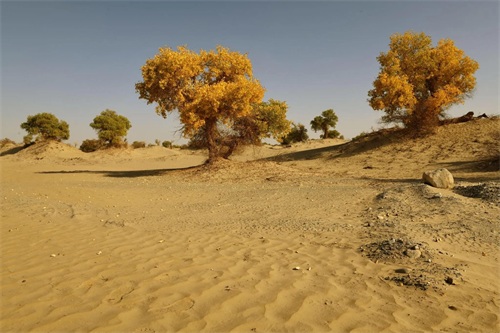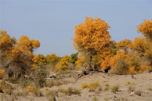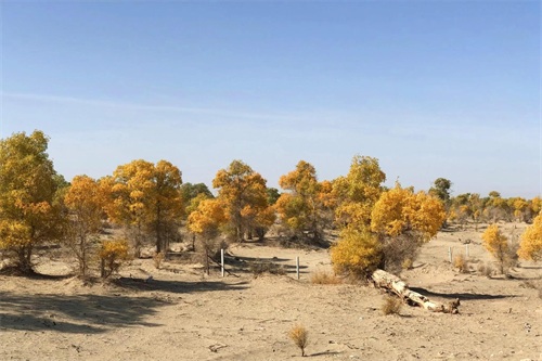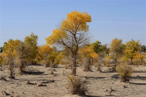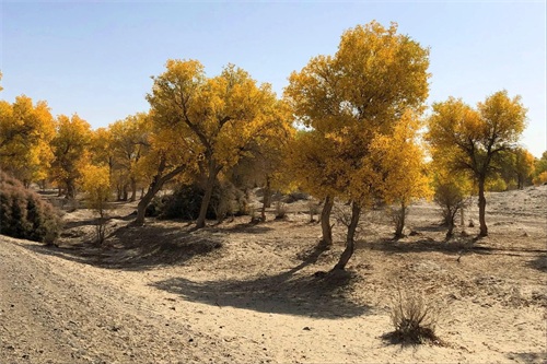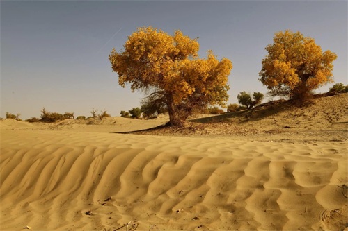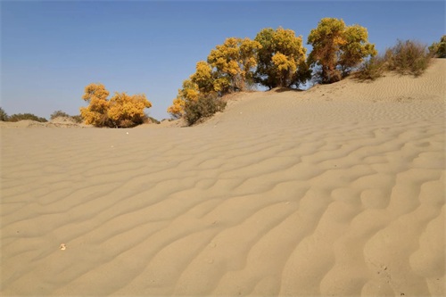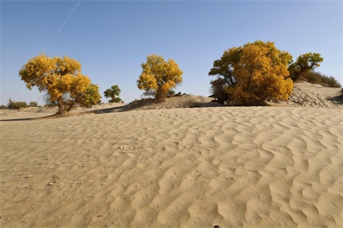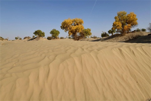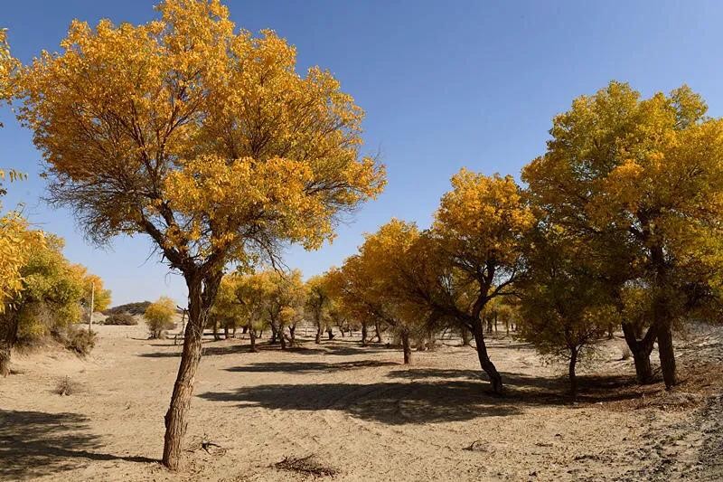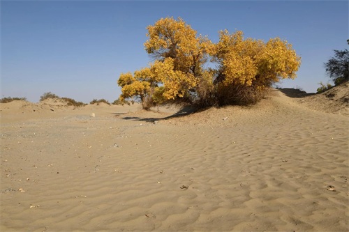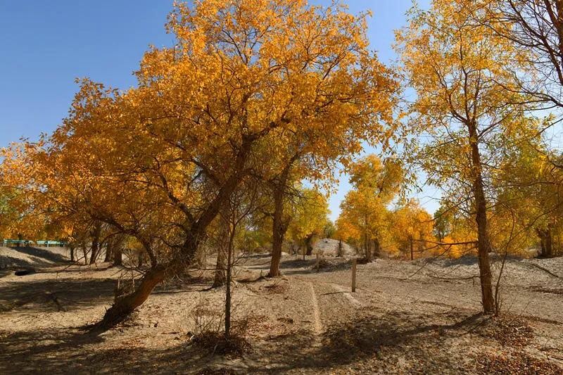 当思绪还沉浸在这片空茫、荒凉的沙漠中时,已经不知不觉中进入了塔里木垦区,一个金色的世界又悄无声息地迎面而来,那便是美丽而壮观的胡杨林。