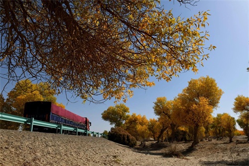 这些胡杨树生长在218国道两旁的塔里木河两岸,绵延数百公里,洋洋洒洒,浩浩荡荡,如一幅壮美的画卷在我们眼前徐徐展开。