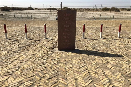 之所以称218国道为“胡杨大道”,还有另个的缘故。在“胡杨大道”上,有一条特殊的路段,该路段位于若羌县境内,距离尉犁县城222公里处。它于1966年8月开建,1971年5月竣工,全长102公里,号称“世界上最长的砖砌公路”。据说,当时之所以用砖修路,是为了稳固道路且防风、防沙。该路段共用了大约6129万块砖,当年由2000余名筑路工人砌成。现保存的砖砌公路不到3公里,如今已经不行驶汽车,只做参观使用。建这条路时,为了烧制红砖,使用了大量胡杨,在“砖砌国道公路简介”石碑上还有这样一句话:“捡拾枯死倒地的风干胡杨木作燃料。”可见,在218国道的建设史上,胡杨也是功不可没。因此,称它为“胡杨大道”再恰当不过。