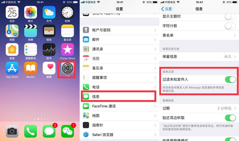 通常有很多人喜欢下载相关的软件屏蔽垃圾短信,不过iPhone手机自己就可以过滤未知信息,我们可以这样设置:找到“设置”——“信息”——“过滤未知发件人”,这样之后,iPhone手机就能够将不在通讯录里面的未知发件人自动过滤掉了,还是非常有效的。