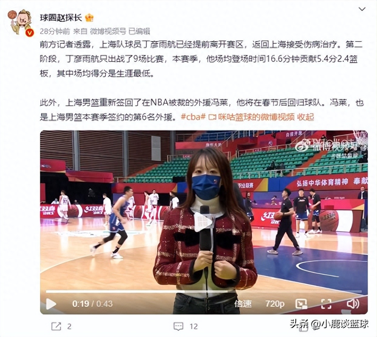根据“球圈赵探长”透露,上海队球员的丁彦雨航已经提前离开赛区,返回上海接受伤病治疗。此外,上海男篮重新签回了在NBA被裁的外援冯莱,他将在春节后回归球队,冯莱也是上海男篮本赛季签约的第六名外援。