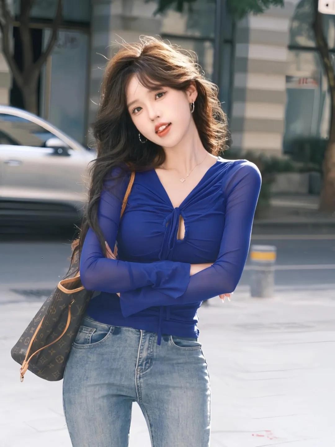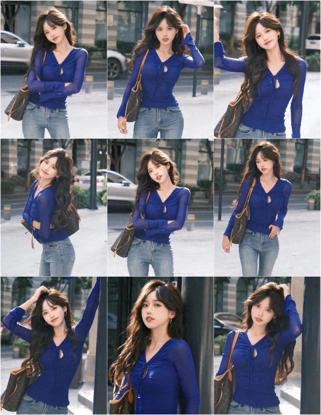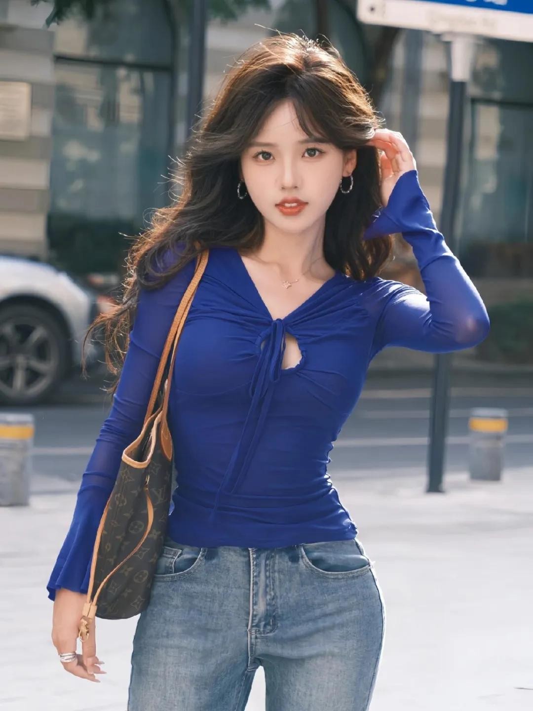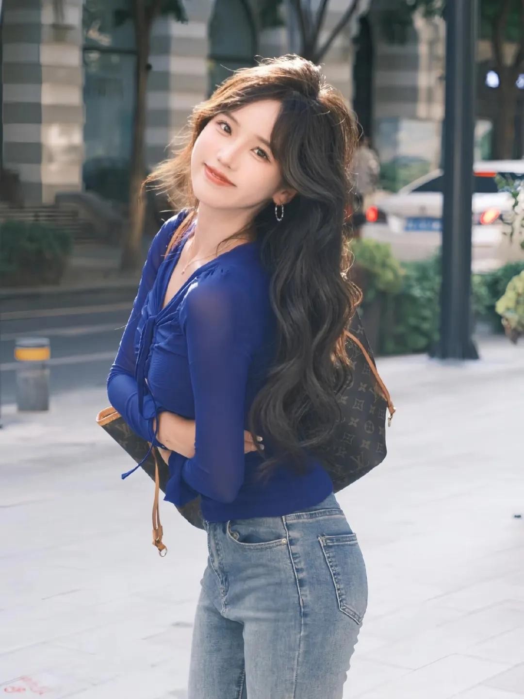想拍出随性又有街拍氛围感的照片,试试这个动作。两脚自然分开站,一只手挎包,另一只手轻轻撩头发,眼神看着镜头或者假装看远方都很出片。这个手部拍照姿势既自然又好看,还能给人一种很松弛的感觉,绝对比剪刀手更有氛围感!