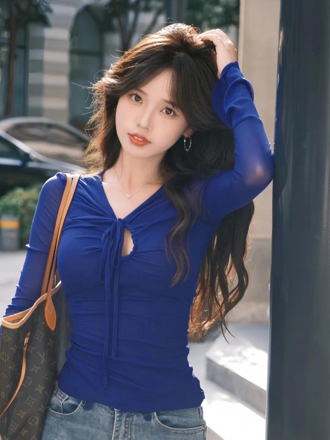 在街头、墙边、栏杆旁特别适合这个姿势。身体微微倾斜,一只手扶着柱子或墙面,另一只手自然地放在头发上或者摸头顶,眼神随意一点,这个动作很适合走温柔风或者时尚风,拍出来上镜好看还特别随性有范儿。
