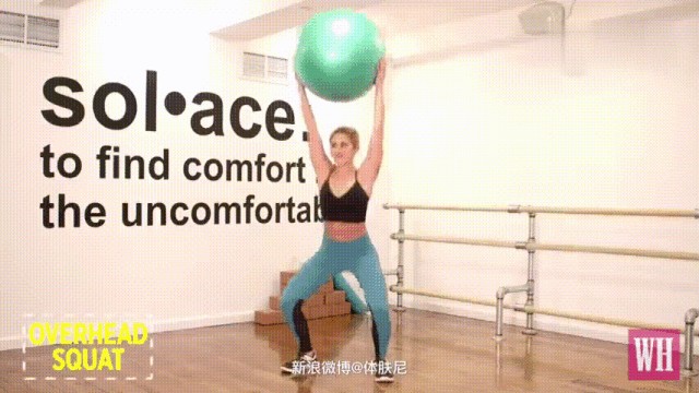背对墙壁站立,在身体与墙壁之间压住一个健身球,然后双手过头举做深蹲动作。