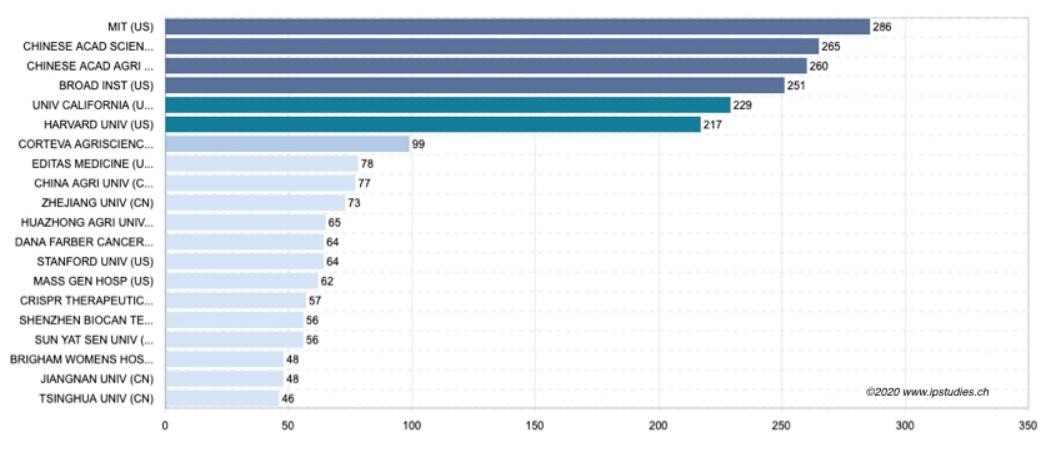 2020年,在诺贝尔奖公布之后,位于瑞士的一家专利分析公司IPStudies曾发布了全球CRISPR技术的专利景观图。