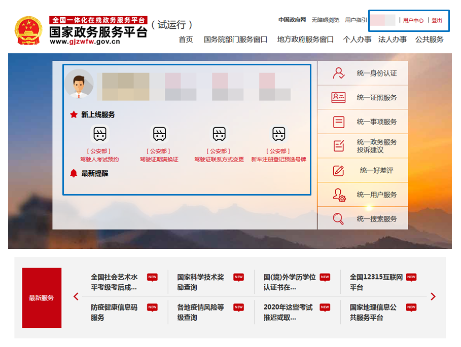3. 进入 "国家政务服务平台" 后点击右上角登陆账号(没有账号需要注册),登陆后在主界面显示登陆用户信息;