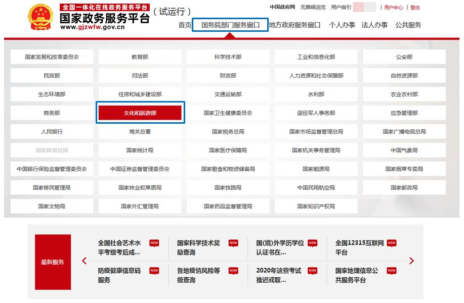 4. 选择页面上的 "国务院部门服务窗口",出现下拉菜单,点击下拉菜单中的 "文化和旅游部";