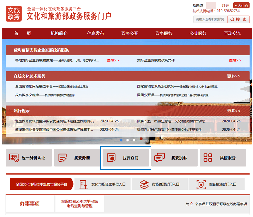 5. 进入 "文化和旅游部政务服务门户",点击下方的 "我要查询";
