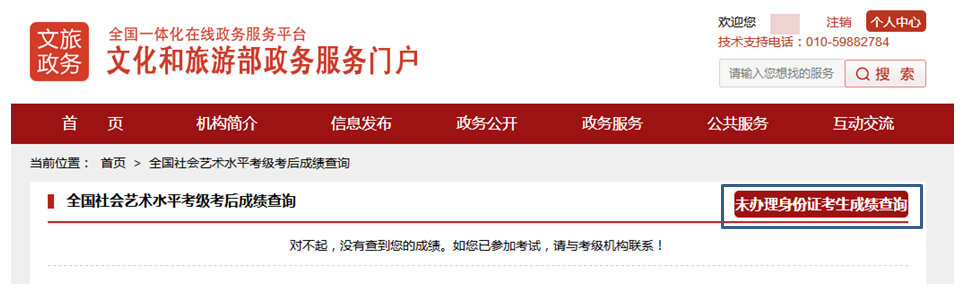 7. 点击右上角的 "未办理身份证考生成绩查询" ;