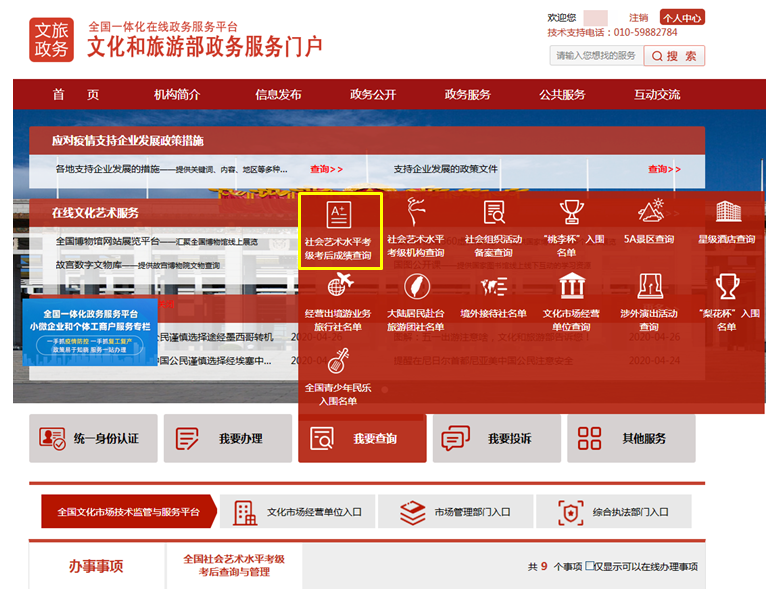 6. 点击 "我要查询" 后出现菜单框,点击里面的 "社会艺术水平考级考后成绩查询";