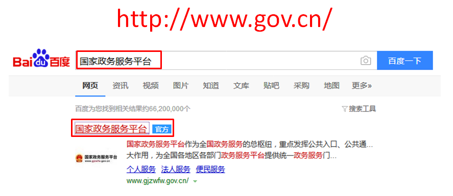 1. 百度搜索 "国家政务服务平台"找到带有 "官方" 字样的链接进入,或者输入网址:www.gov.cn进入;