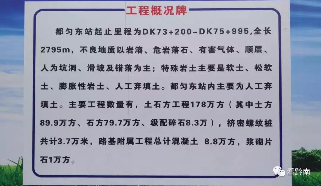 现场设置了多个公告牌,其中的“工程概况牌”显示,此处正在建设都匀东站工程,将进行人工填土,主要工程数量有:土石方工程178万方,挤密螺纹桩共计3.7万米,路基附属工程总计混凝土8.8万方,浆砌片石1万方。