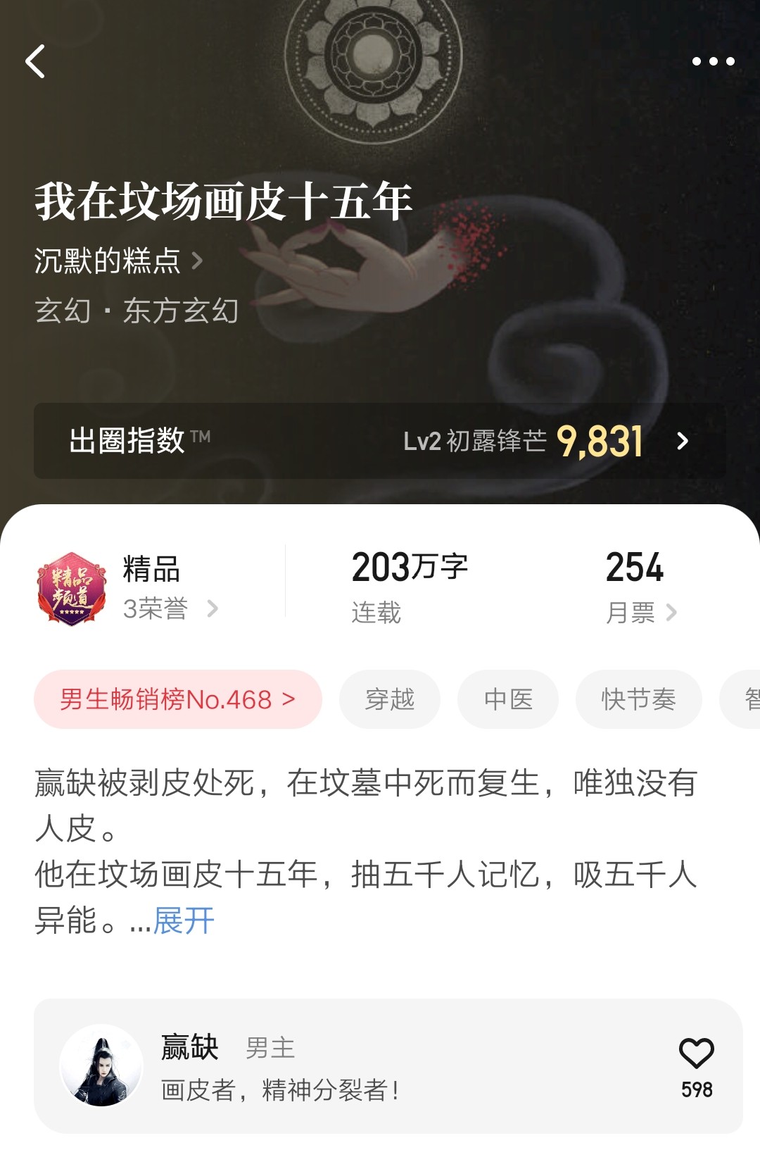 玄幻大神沉默的糕点又写完了一部作品,真是速度。这本《我在坟场画皮十五年》今年一月六号上线的,到完结就用了七个月出头的时间。而总字数已经过了两百万,说明他的日常更新还是很快的。