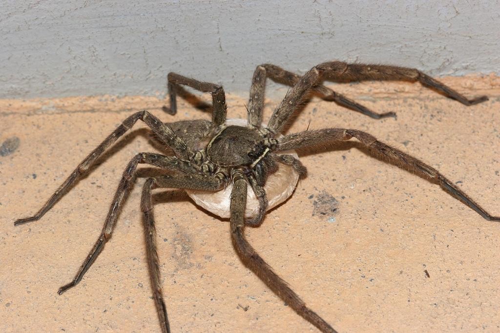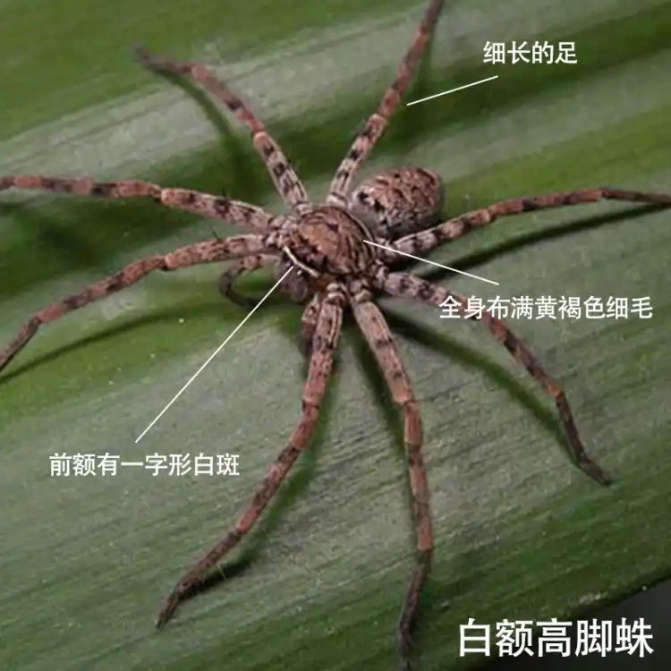 白额高脚蛛:蜘蛛目-高脚蜘蛛科,有个威风凛凛的别名“马龙骑”,躯体长20mm-30mm,全长(包括脚)约100mm-130mm,脚张开大概有我们碗口大小,身体被黄黑色绒毛覆盖,额头部有一条白色带状条纹,所以叫白额高脚蛛。雌性白额高脚蛛体型比雄性大,雄性背部有一个很大的黑色v字型条纹。