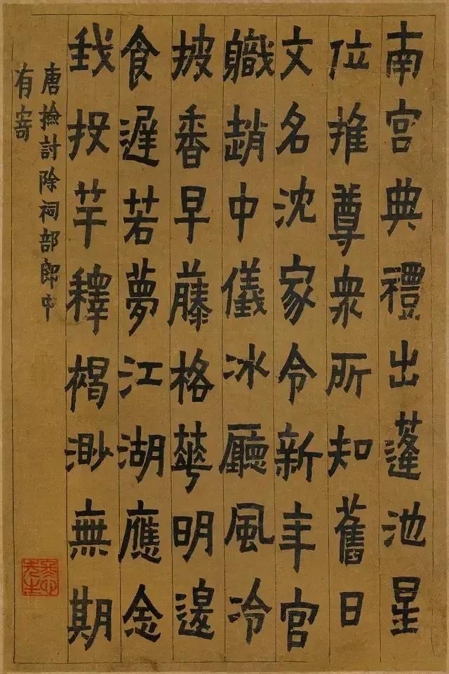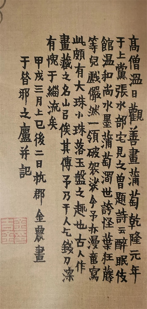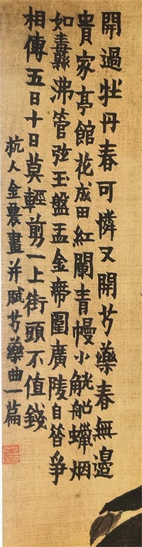 金农(1687—1763),清代书画家,扬州八怪之首。字寿门、司农、吉金,号冬心先生、稽留山民、曲江外史、昔耶居士、寿道士等,钱塘(今浙江杭州)人,布衣终身。书法创扁笔书体,兼有楷、隶体势,时称“漆书”。金农的楷书融合了《国山碑》、《天发神谶碑》等石刻文字,以稚拙朴厚为妍,楷书多隶意,表现出很强的个性,自称“漆书”,对后世有一定影响。