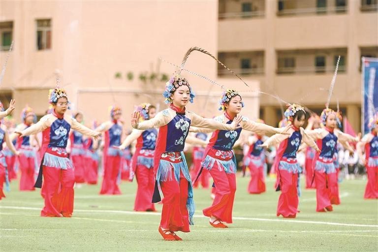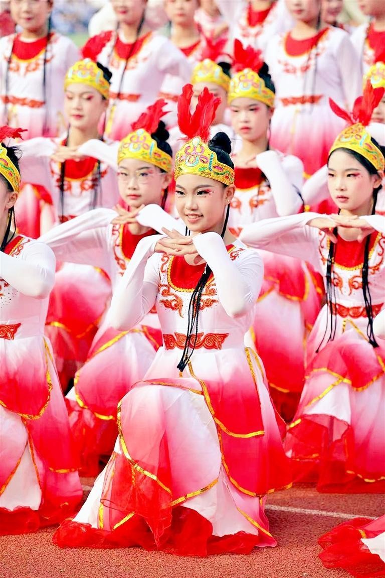 开幕式上,还精心准备了丰富多彩的文艺节目表演。三年级、四年级的同学们带来了《俏花旦》,展现了中华优秀传统文化的魅力;八年级的同学们表演了《运球帷幄》,展示了他们精湛的球技和团队协作能力;艺体高中部的同学们则带来了《送你一朵玫瑰花》,用歌声和舞蹈传递爱与温暖;高二年级的同学们表演了《功夫旗》,将武术与旗帜完美结合,展现了力与美的交融;五年级、六年级的同学们联袂呈现了《少年中国说》和《灯火里的中国》,用朗诵和歌唱表达了对祖国的热爱和对未来的憧憬;最后,全体方阵演员和歌手聂群共同演绎了《远方的客人请你留下来》和《有我》,将现场气氛推向了高潮。