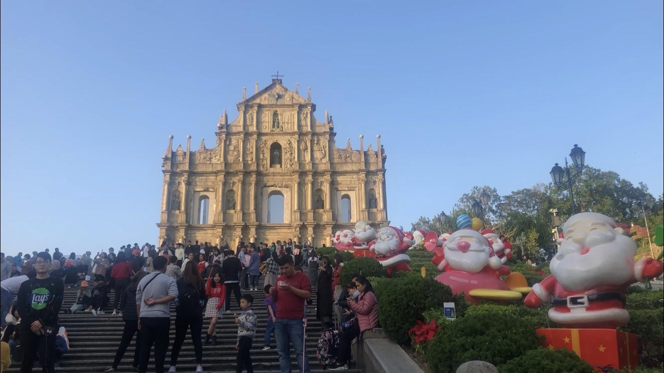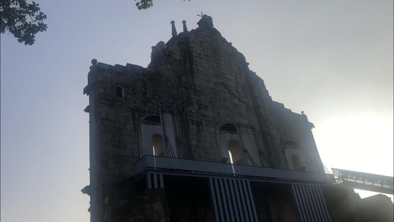所以,这个就要牵扯到大三巴牌坊的由来了。这个大三巴牌坊所在地,以前是一座教堂,后来因为一场大火,嗯,我也不知道是什么原因产生的大火,导致整个教堂就被烧毁了,只留下来一面墙,就是这个大三巴牌坊了。所以,它本来就是一个外墙,而不是举着名字的牌子而已。在电视和网上看澳门的介绍,都会提到这个大三巴牌坊,总是出现的都是正面照,然后有一个就比较好奇,这个大三巴牌坊的背后,到底是什么样子的,为什么这个单薄的外墙,这么多年都没有倒塌呢。