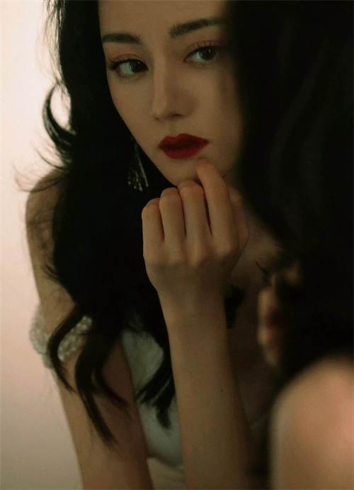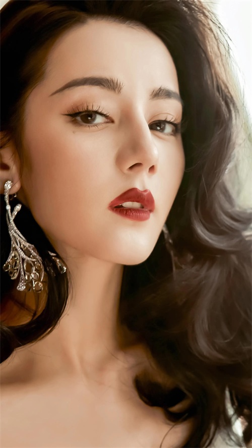 五官精致漂亮,眼睛大眼珠黑亮,睫毛整齐的一排非常卷翘,眉毛浓黑,嘴唇是复古砖红。妆容色彩比较重,更突显她的美丽。