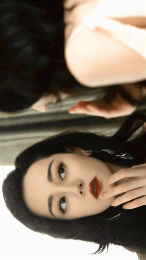 长卷发让她看起来慵懒好看,黑发红唇充满复古美人气质。