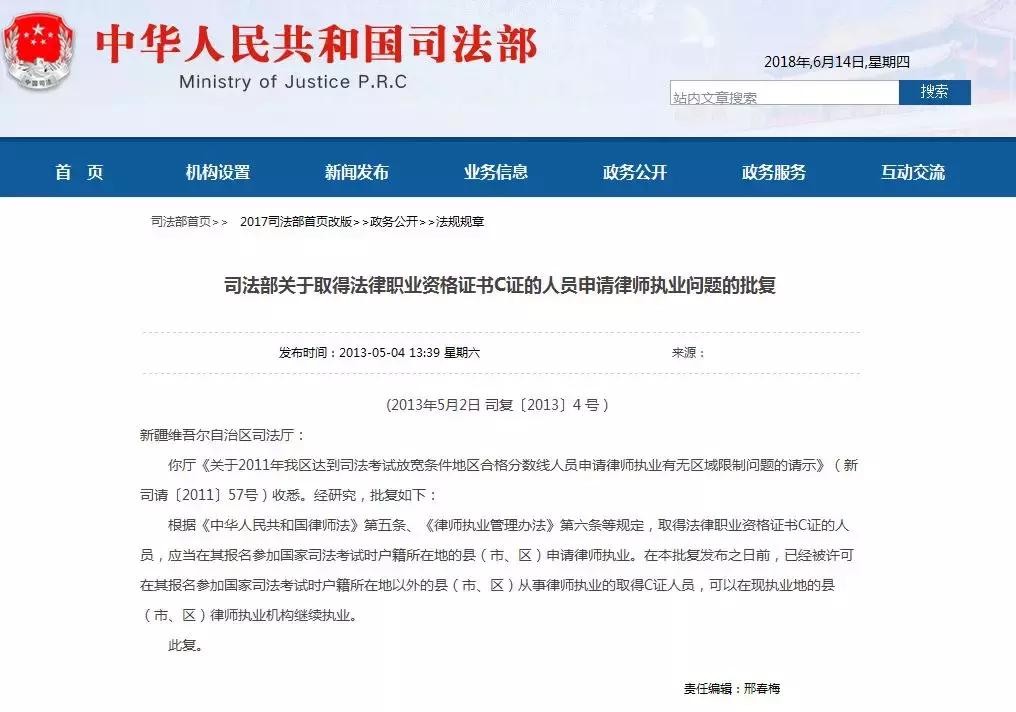而此前,司法部于2013年5月2日就新疆维吾尔自治区司法厅《关于2011年我区达到司法考试放宽条件地区合格分数线人员申请律师执业有无区域限制问题的请示》进行了批复。