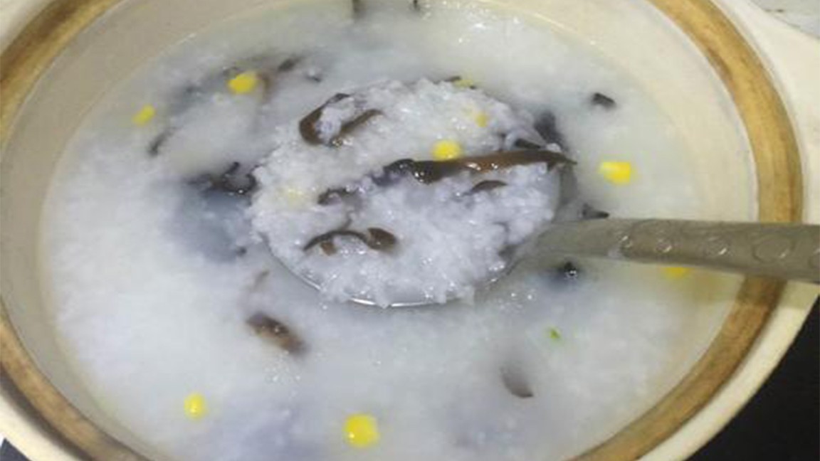5、黑木耳切丝,黄瓜切丁,葱切末备用;粥熬得米开花时加玉米粒、黑木耳丝转大火煮2分钟;
