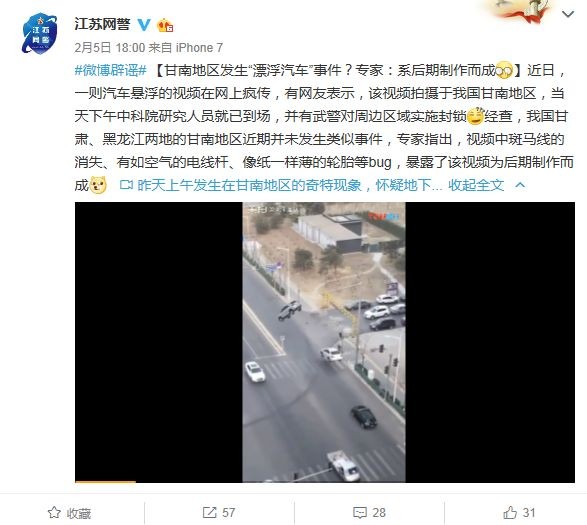 江苏网警就曾对此辟谣,专家指出这是后期制作而成。