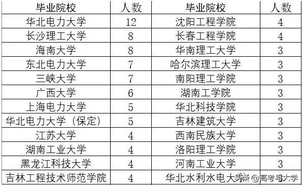 录用人数最多的华北电力大学17人(北京12人,保定5人),长沙理工大学、海南大学各8人,东北电力大学、三峡大学各7人,广西大学6人,上海电力大学5人