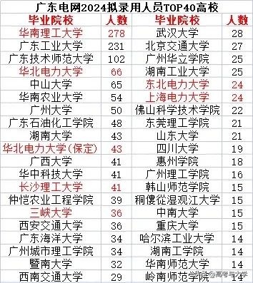 广东电网2024录用2686人,主要华南理工296人,广东工业大学231人、广东技术师范大学102人、华北电力大学66人,原电力部直属高校长沙理工41人、三峡大学36人、东北电力和上海电力24人。广东省本省院校录用人数较多。