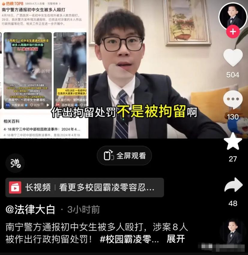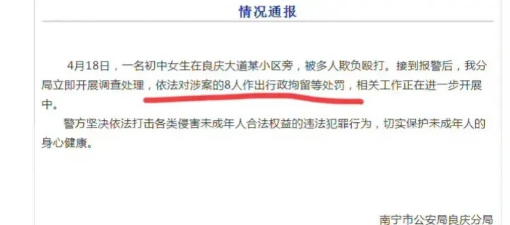 这个事件曝光后,南宁警方也介入调查,并对8名施暴女生作出了行政拘留等处罚。