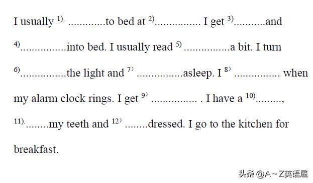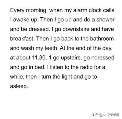 提示:Every morning, when my alarm clock calls I awake up. Then I go up and do a shower