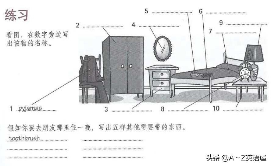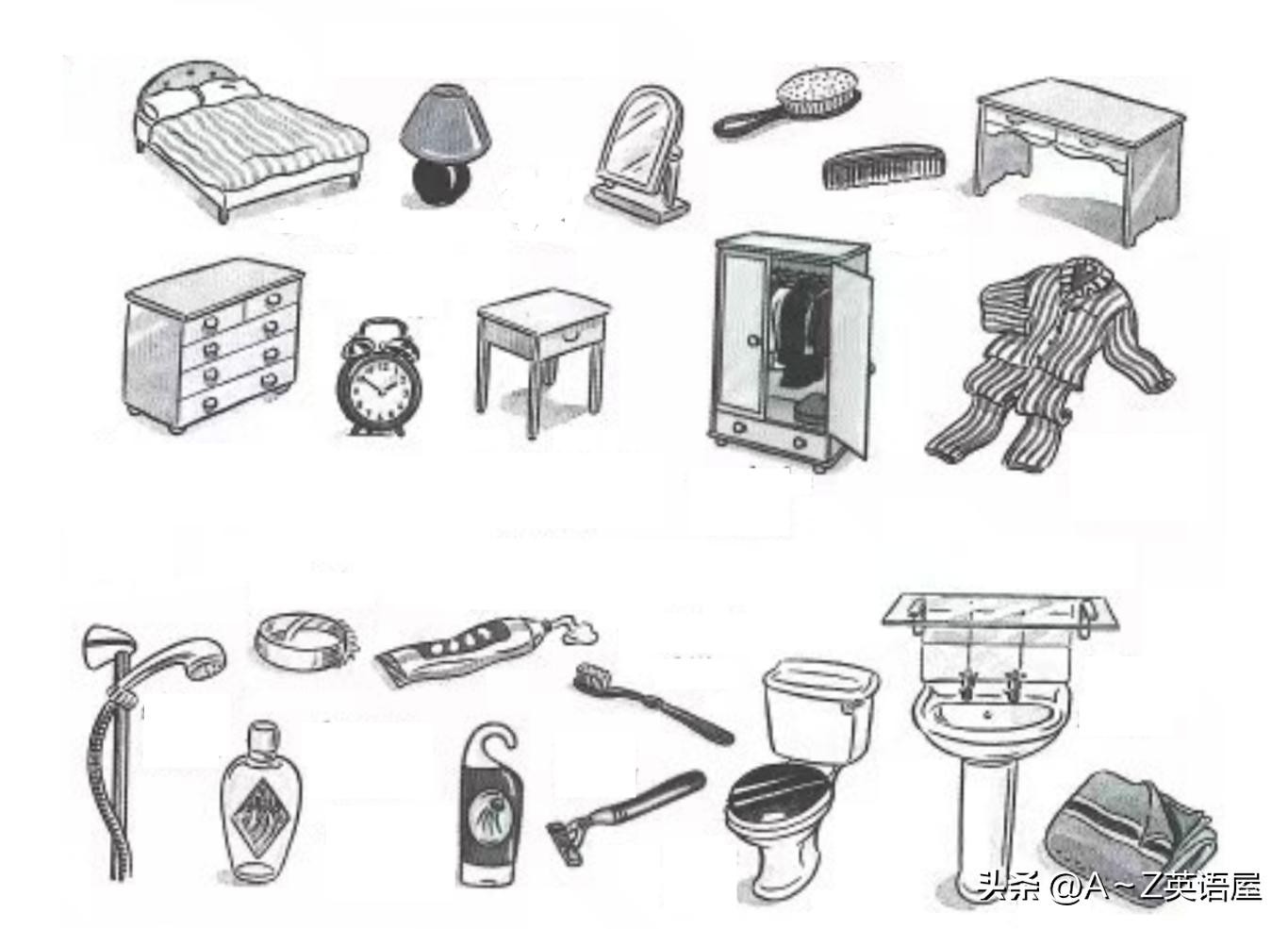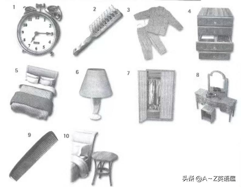 alarm clock /əˈlɑːm klɒk/ 闹钟bed /bed/ 床bedside lamp /ˈbedsaɪd læmp/ 床头灯bedside table /ˈbedsaɪd ˈteɪbl/ 床头柜chest of drawers /tʃest əv ˈdrɔːz/ 五斗橱comb /kəʊm/ 梳子dressing table /ˈdresɪŋ ˈteɪbl/ 梳妆台hairbrush /ˈheəbrʌʃ/ 发刷mirror /ˈmɪrə/ 镜子pyjamas /pəˈdʒɑːməz/ 睡衣裤wardrobe /ˈwɔːdrəʊb/ 衣橱