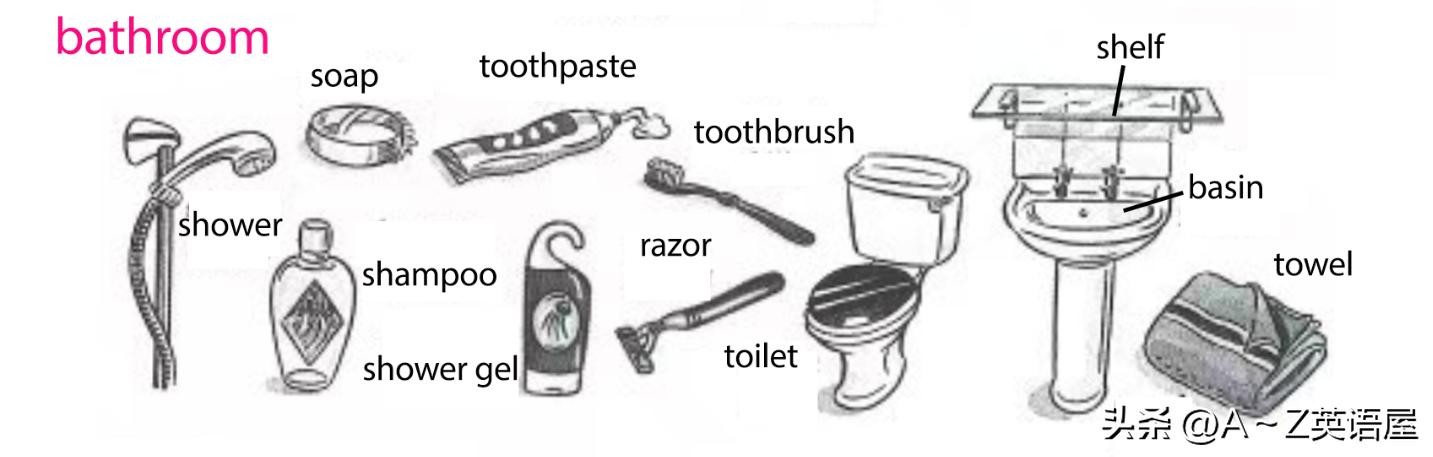 basin /ˈbeɪsn/ 洗脸盆razor /ˈreɪzə/ 剃须刀shampoo /ʃæmˈpuː/ 洗发水shower /ˈʃaʊə/ 淋浴器shower gel /ˈʃaʊə dʒel/ 沐浴露soap /səʊp/ 肥皂shelf /ʃelf/ 架子toilet /ˈtɔɪlɪt/ 马桶toothbrush /ˈtuːθbrʌʃ/ 牙刷toothpaste /ˈtuːθpeɪst/ 牙膏towel /ˈtaʊəl/ 毛巾