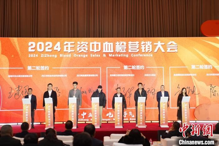 中新网内江12月18日电(王爵 张啸)18日,2024年资中血橙营销大会在四川省内江市资中县举行,资中本地种销企业与国内外客商进行了现场签约仪式,共签约4.8万吨资中血橙订单,其中包括1.6万吨出口订单。