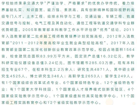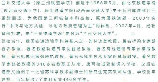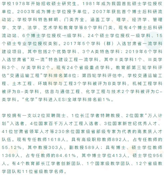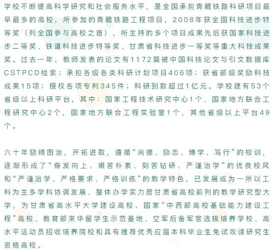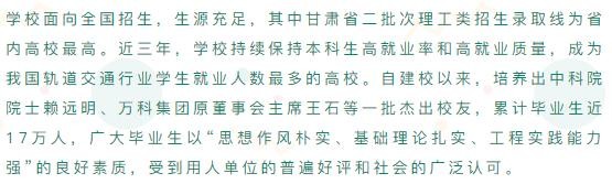 兰州交通大学(Lanzhou Jiaotong University),简称兰交大,位于甘肃省会兰州市,是甘肃省高水平大学建设院校,入选教育部“卓越工程师教育培养计划”、“中西部高校基础能力建设工程”,为教育部本科教学工作水平评估优秀高校、中国轨道交通职业教育联盟理事单位、中国人民解放军空军后备军官选拔培养院校、“中俄交通大学联盟”成员、第二批全国深化创新创业教育改革示范高校,是一所以工科为主,理学、经济学、管理学、文学和艺术学兼有的教学研究型大学,具有推荐优秀应届本科毕业生免试攻读研究生资格。