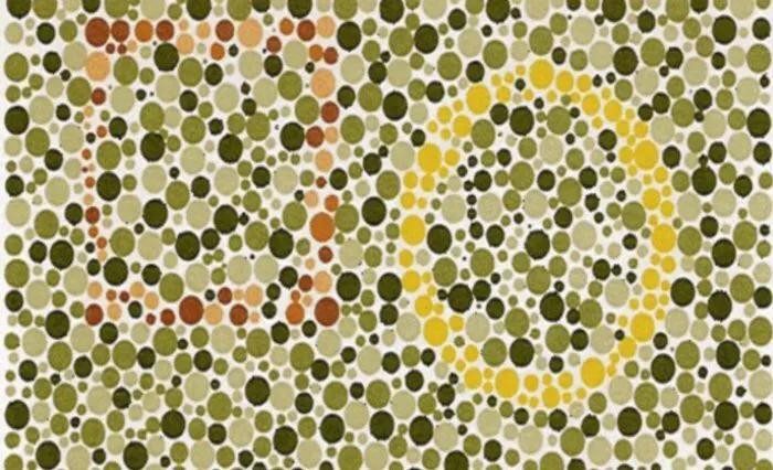 第三张图就很好辨认了,没有什么干扰信息,图中大面积的绿色为底色,左边是偏橘色的正方形,右边则是黄色的圆形,这张图可以用来筛选出全色盲、红绿色盲。
