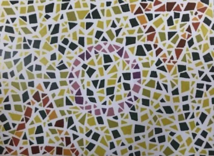 第四张图的元素较多,由绿色几何形做底,中间是由紫色几何形构成的圆形,左右分别在上部与下部各有一个三角形。但是同样没有太多的干扰信息,主要是用来检测被测试的人员是否属于红绿色盲。