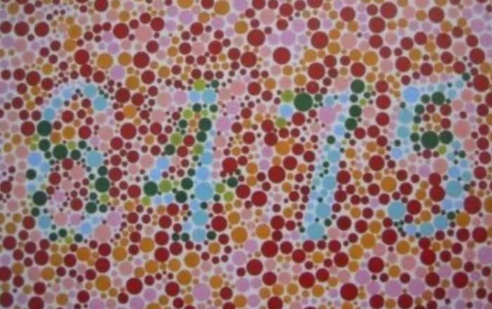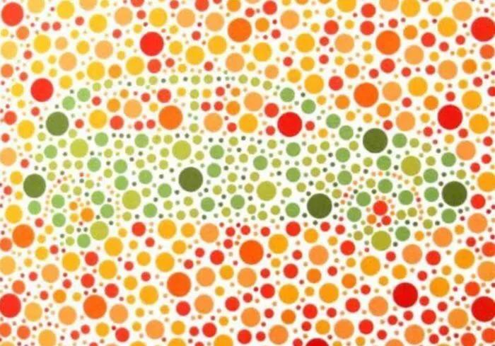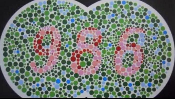 图二可以用来检测自己是否能够分辨出红色、绿色与蓝色,主要是用来筛选红绿色盲的检测图,图中绿色、蓝色小圆形为底,上面是由粉色、红色小圆形构成的“986”,不知道大家看出来了吗?