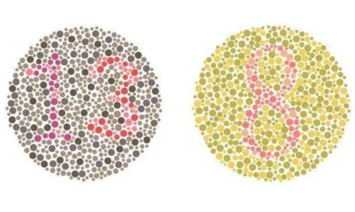 第一张图上是两个圆形,左边灰色的圆形中是由两种红色构成的“13”,右边是由黄绿色的小圆形构成的大圆形,中间是由粉红色与淡橘色构成的数字“8” ,可以用来检测出自己是否能够看出红色与黄色。