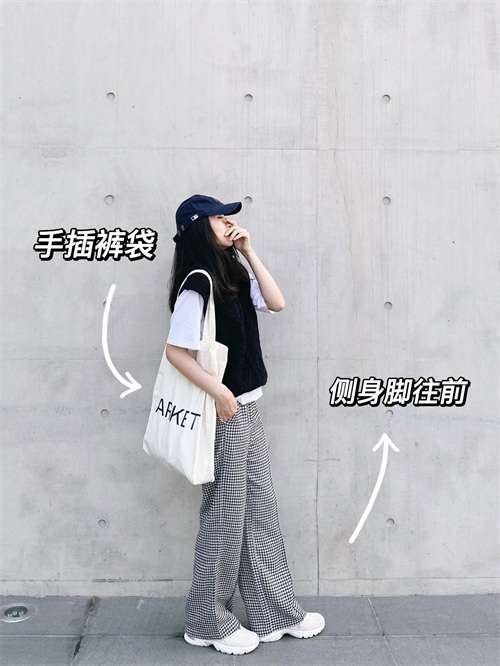将一只手轻松地插入裤袋中,身体侧向镜头,一只脚微微向前迈出,既展现出优美的曲线,又显得自信大方,这个姿势不仅让身体看起来更加修长,还能展现出一种随性自然的氛围。