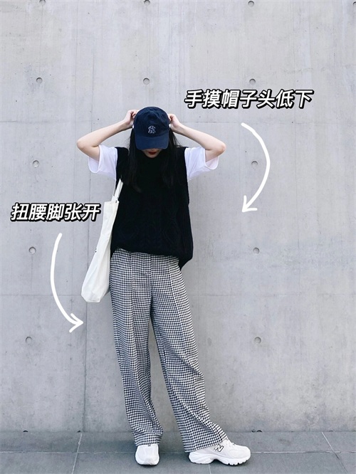 站立拍照,可以将一只脚稍微张开向一侧,一手轻轻摸着头顶的帽子,同时头部略微低下,展现出一种轻松自然的氛围。这个姿势既能突出腿部线条,又能营造出时尚感。