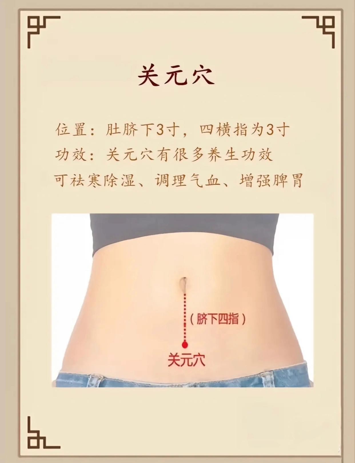 2、关元穴是小肠的募穴,为男子藏精,女子蓄血之处,是足太阴脾经、足厥阴肝经、足少阴肾经与任脉的交会穴,故统治足三阴、小肠、任脉诸经病。具有补肾壮阳、温通经络、理气和血、补虚益损、壮一身之元气的作用,古今都作为保健的要穴。关元穴位于腹部,身体前正中线,脐中下3寸。
