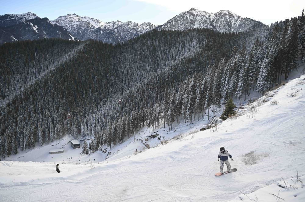 在乌鲁木齐县水西沟镇平西梁村民宿的天台南望,群山间的银色雪道如丝带自山顶蜿蜒而下,那是新疆首家5S级滑雪场——丝绸之路山地度假区,每个雪季都能迎来三四十万名雪友。