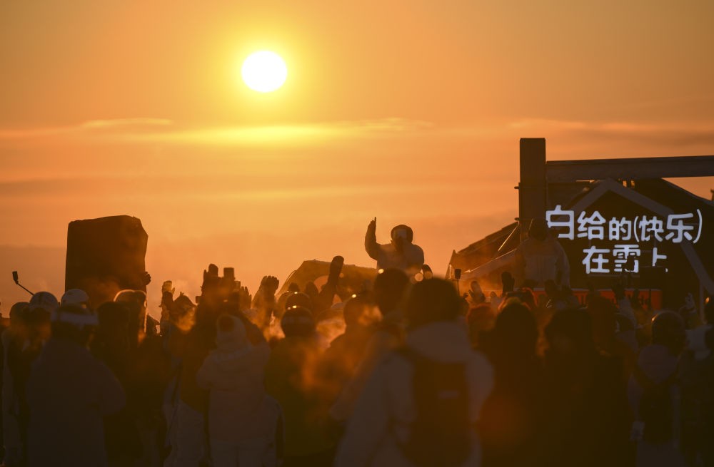 新华社乌鲁木齐2月20日电 落日余晖洒在阿勒泰市将军山国际滑雪度假区的山顶,漫山白雪被染成橙粉色。在现场电子音乐强劲的鼓点中,上千名滑雪爱好者欢呼摇摆,在零下十几度的雪地里感受“蹦雪迪”的欢快。