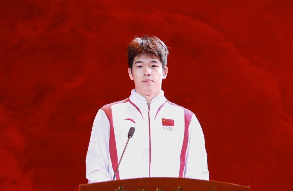 巴黎奥运会冠军潘展乐在“决胜巴黎·绽放奥运——奥运冠军面对面”巡回宣讲活动新疆站上演讲。