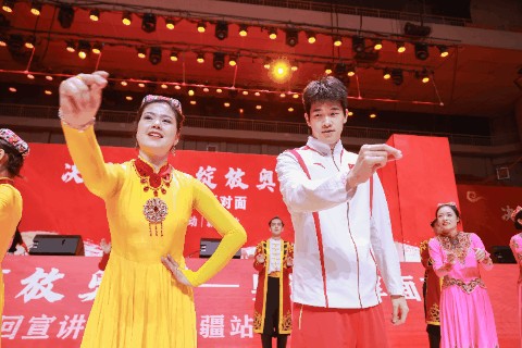 在阿克苏市的新疆理工学院,冠军们的宣讲不时被热烈的掌声打断。潘展乐讲到“巴黎奥运会上,我不是一个人在战斗,我的背后是国家”时,收获了经久不息的欢呼声。