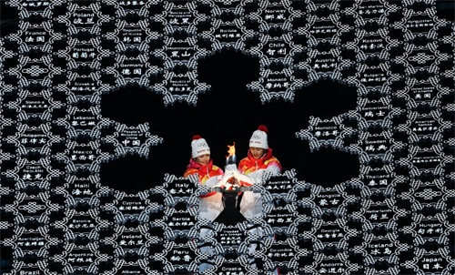 2022年2月4日,北京冬奥会最后一棒火炬手迪妮格尔·衣拉木江(左)和赵嘉文将火炬嵌入“大雪花”中央。新华社记者 李尕 摄
