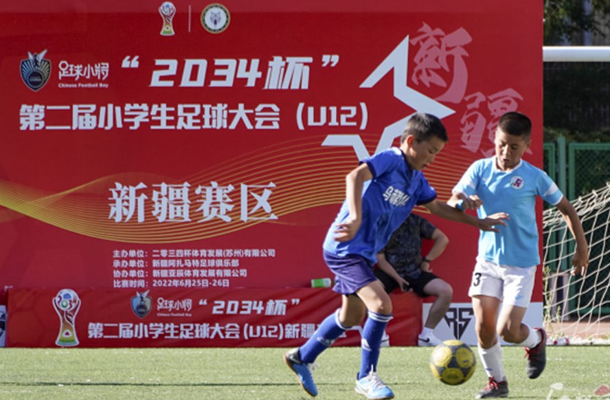 “2034杯”第二届小学生足球大会(U12)新疆赛区比赛中,乌鲁木齐市第121小学足球队员(左)在和对手拼抢。杨伟 摄