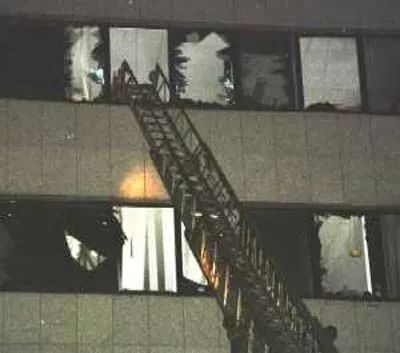 救援人员架起云梯解救被困使馆人员。(吕岩松摄)