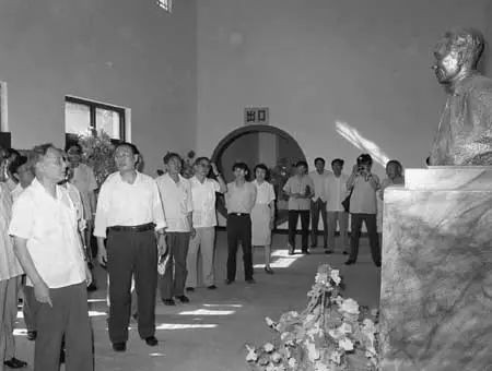 1990年,时任新华社社长的穆青(左二)在河南省兰考县参观焦裕禄纪念馆。
