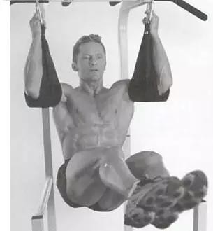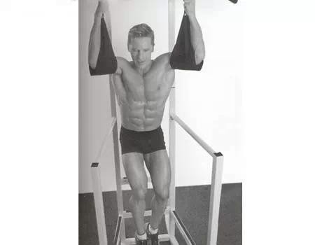 初始位置:将身体悬挂在与肩同宽的引体杆上,或者用上臂支撑在靠垫上,然后让双腿放下,保持放松,双膝微弯,脚尖伸直。